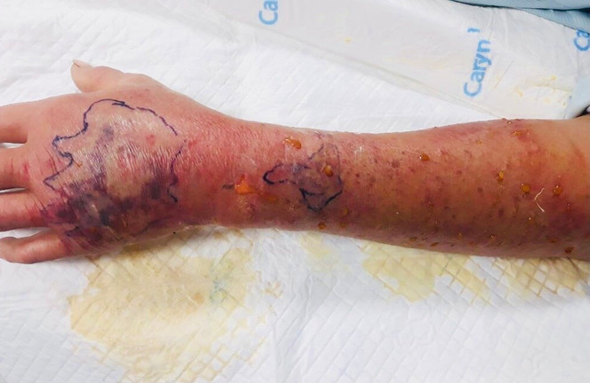 Khi vào viện, cẳng tay trái của bệnh nhân sưng nề, vùng hoại tử diện tích lên 6cm. Kết quả chụp MRI cho thấy người này bị viêm mô tế bào tổ chức dưới da. Sau 3 ngày điều trị, vết thương lành dần.