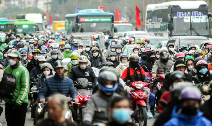 Trên tuyến đường Giải Phóng hướng đi nội đô, xe máy đổ về đây khá đông bắt đầu từ 17h30 khiến một đoạn đường dài chừng 1km đã ùn tắc kéo dài. Dự báo tình trạng ùn tắc tại đây có thể kéo dài nhiều giờ khi lượng phương tiện vẫn tiếp tục đổ về vào chiều tối.