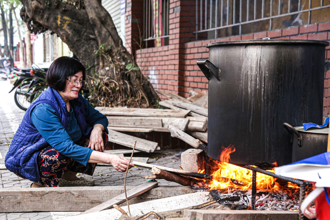 Ngay giữa phố Hồ Tùng Mậu (quận Bắc Từ Liêm), gia đình anh Hùng nổi lửa để luộc nồi bánh chưng đón Tết Nguyên đán.
