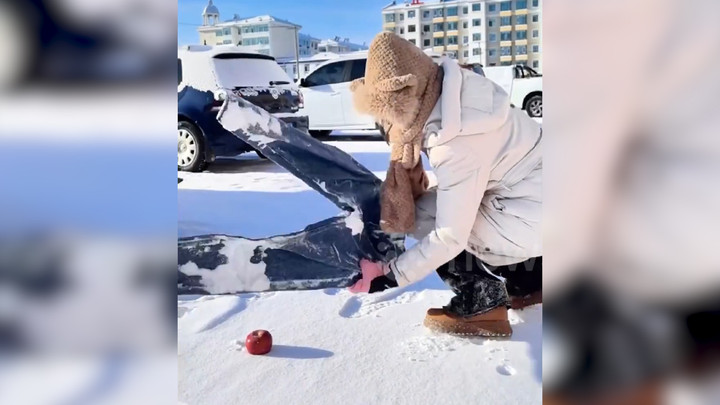 Nhiệt độ giảm sâu -20 độ C, người phụ nữ tại Hắc Long Giang, Trung Quốc dùng chiếc quần jean đông cứng để cắt đôi quả táo.