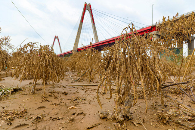Chịu ảnh hưởng bởi hoàn lưu bão số 3, nước sông Hồng dâng lên báo động 2 khiến gần 70% số đào Nhật Tân trồng sát bờ sông thiệt hại nặng nề, cây chết khô, trụi lá.