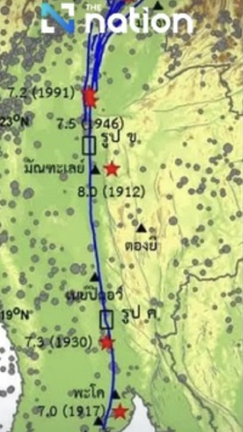 Đứt gãy Sagaing, một đường đứt gãy dài 1.200 km chạy theo hướng Bắc - Nam là nguồn gốc hai trận động đất lịch sử tàn phá Myanmar.