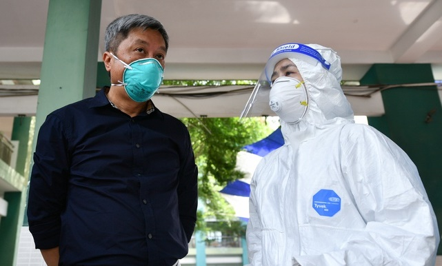 Thứ trưởng Bộ Y tế Nguyễn Trường Sơn kiểm tra công tác xét nghiệm bằng test nhanh tại một điểm lấy mẫu ở quận Tân Phú. (Ảnh: Duy Hiệu)