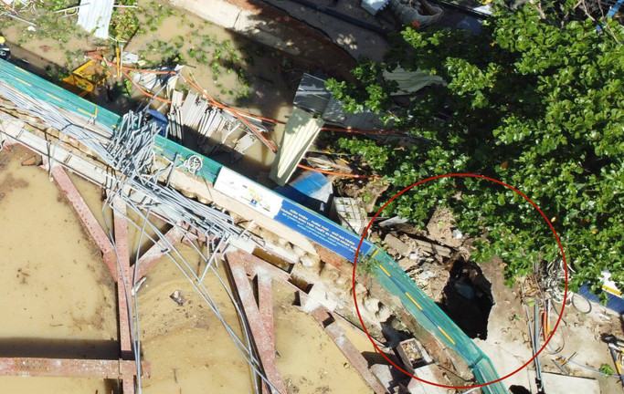 Phần sụt lún trên vỉa hè lan rộng ra ngoài mặt đường khoảng 1 mét, dài 4 - 5 mét. Các đường ống nước, bảng hiệu ngăn cách khuôn viên dự án Chung cư Phú Tài 2 cũng bị sụt xuống hố.