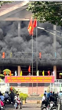 Tấm thảm trong phòng họp A (tầng trệt) cháy và lan ra khắp phòng rồi bùng lên dữ dội, khói bao trùm sảnh chính của trụ sở UBND tỉnh Bình Phước.