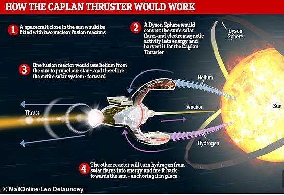Nhà vật lý Matthew Caplan đưa ra ý tưởng di chuyển Hệ Mặt trời bằng một thiết bị khổng lồ lấy năng lượng từ sức nóng của Mặt trời.