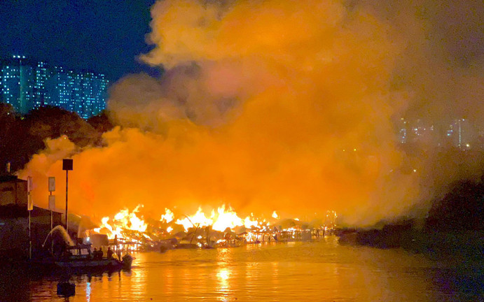 Dãy nhà ven kênh như bị nuốt chửng bởi ngọn lửa đỏ rực.