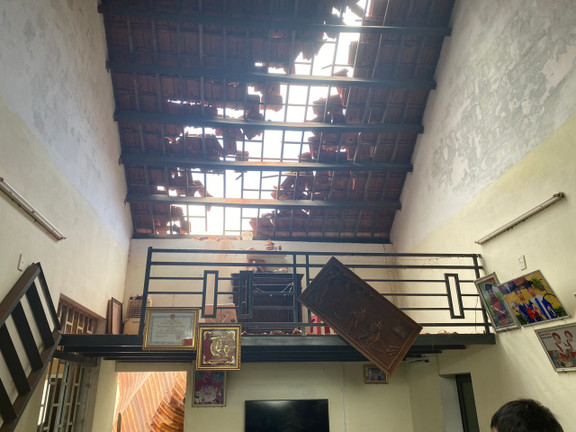 "Tôi và cả nhà đang ăn ở nhà trên. Nghe tiếng nổ ai nấy cũng khiếp vía, chứng kiến nhà sau đổ sập và mái tôn bị cuốn phăng, tôi như chết điếng" - anh Quốc kể.