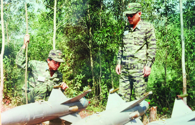 Nguyên Phó Tham mưu trưởng Quân chủng PK-KQ Nguyễn Quang Hùng (đứng) kiểm tra mục tiêu bay cho pháo cao xạ năm 1994. (Ảnh: nhân vật cung cấp)