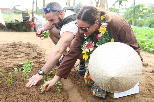 Và sau mươi phút đồng hồ dạo bước thưởng ngoạn cánh đồng rau đang vào vụ Tết, 19 du khách đến từ xứ sở mỳ ống chính thức "hóa thân" thành nông dân thực thụ khi xắn tay áo cầm cuốc xới đất.