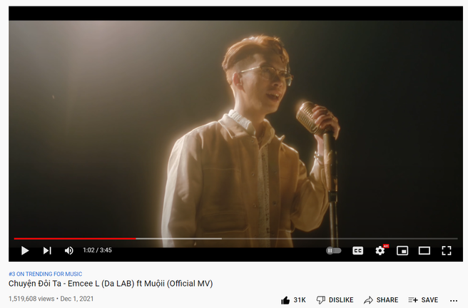 Chỉ sau vài ngày ra mắt, MV mới nhất của Emcee L (thành viên nhóm nhạc Da Lab) mang tên “Chuyện Đôi Ta” đã có mặt trong tab thịnh hành của Youtube.