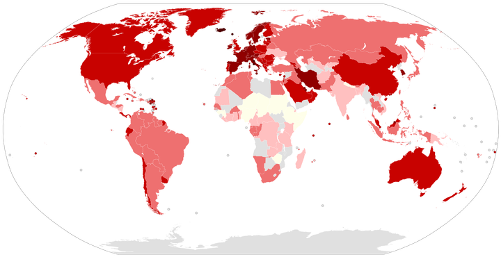 Số quốc gia và vùng lãnh thổ có người nhiễm Covid-19 đã lên tới 185, bao trùm khắp 5 châu lục. Với tốc độ lây lan hiện nay, theo dự báo đại dịch Covid-19 sẽ lan tới tất cả các quốc gia và vùng lãnh thổ trên toàn cầu.