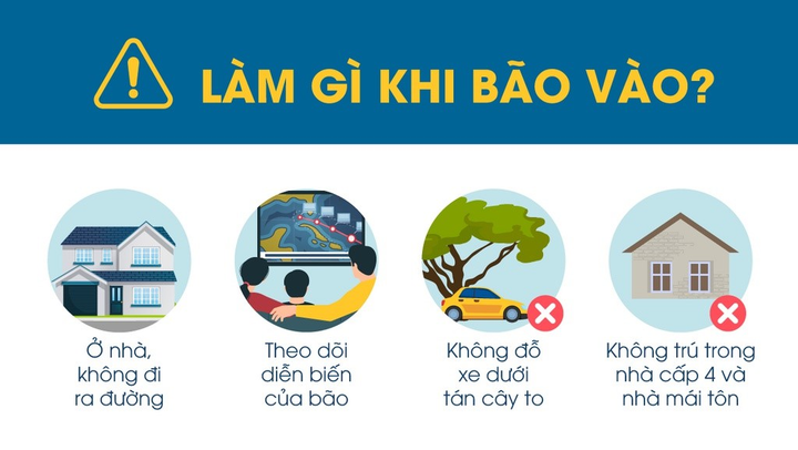 Khi bão vào đất liền, người dân cần ở yên, không ra ngoài đường, không đỗ xe dưới tán cây to, tắt các nguồn điện chính, chuyển đồ lên cao và tuân theo lệnh sơ tán.