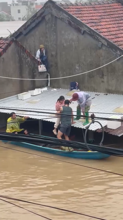 Đội cứu hộ tiếp cận ngôi nhà ngập giải cứu 3 người mắc kẹt trên nóc nhà tại phường Phú Yên, tỉnh Đắk Lắk.