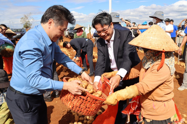 Ông Lê Quốc Thanh - Giám đốc Trung tâm Khuyến nông Quốc gia tham gia thu hoạch khoai tây cùng bà con nông dân.