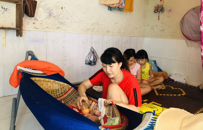 Đối diện nơi vợ chồng chị Ngọc sống là căn phòng trọ vỏn vẹn 15m2 của chị Nguyễn Thị Bình (27 tuổi, quê Thừa - Thiên Huế). Chồng chị Bình là thợ hồ, còn chị từng làm công nhân may ở một cơ sở tư nhân. Hai vợ chồng chị có 3 người con, gái lớn 9 tuổi, gái thứ hai 7 tuổi và trai út 3 tháng tuổi.