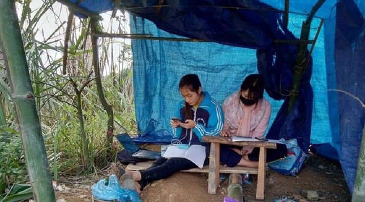 Bức ảnh hai nữ sinh ngồi say sưa học trong lán dựng trên đồi để dễ bắt sóng điện thoại, thu hút sự quan tâm của dân mạng.
