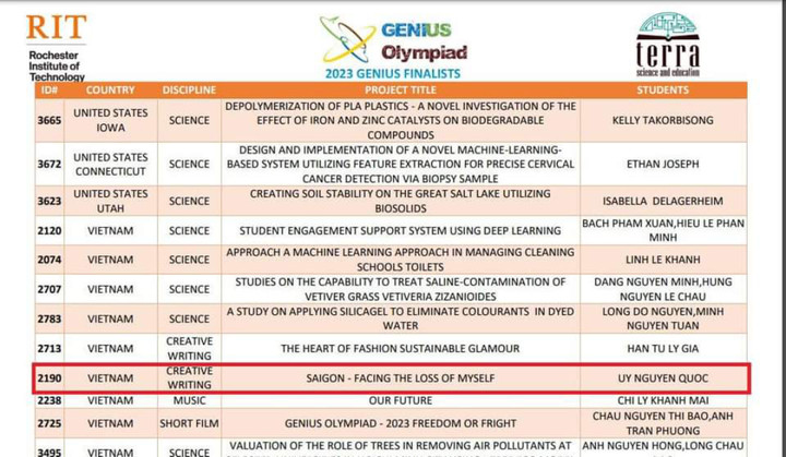 Như VTC News đưa tin, ngày 6/7, tài khoản Facebook có tên M.C (cựu học sinh Trường THCS Lê Văn Tám, quận Bình Thạnh, TP.HCM), chia sẻ, tham gia cuộc thi Genius Olympiad 2023 diễn ra tại Mỹ. Nữ sinh M.C tố bị "đánh cắp" đề án viết trong cuộc thi này.