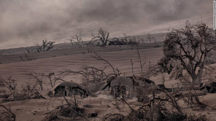 Hình ảnh từ núi lửa Taal đang phun trào ở Philippines cho thấy khung cảnh hoang tàn của những ngôi nhà bị phá hủy và cây cối bị gãy phủ dưới lớp tro dày.
