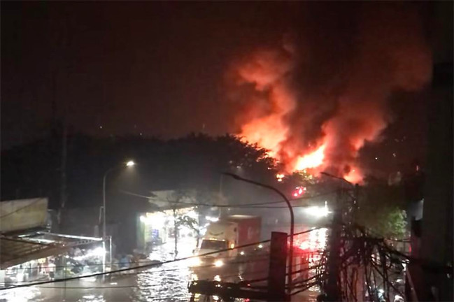 Giữa lúc còn ngập 0,3-0,5m sau mưa lớn, nhà xưởng trên đường Tân Triều Mới bất ngờ bốc cháy dữ dội lúc nửa đêm.