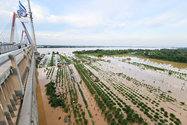 Sau đợt mưa lớn, mực nước sông Hồng đoạn qua Hà Nội dâng cao, nhấn chìm nhiều vườn đào, quất ven bãi bồi, người dân đứng ngồi không yên lo mất trắng vụ Tết.