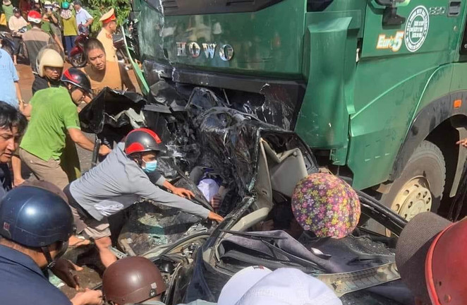 Tại hiện trường, chiếc ô tô con bị kẹp giữa hai xe tải. 3 người ngồi trên xe ô tô con chết tại chỗ, còn tài xế xe này cũng bị thương nặng.