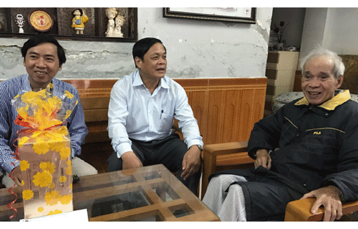 Ông Võ Ngọc Đồng, Chủ tịch UBND huyện Hoàng Sa, Đà Nẵng (giữa) thăm hỏi ông Võ Như Dân năm 2018. (Ảnh: Kim Oanh)