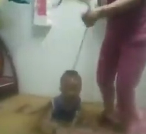 Trong video, người phụ nữ là mẹ của bé trai kéo sợi dây buộc vào cổ của bé rồi đánh tới tấp vào mặt, vào đầu của bé. Khi bé bị ngã xuống và la khóc thảm thiết, người phụ nữ không dừng lại mà tiếp tục kéo đầu bé dậy và đánh tiếp. Thậm chí, người phụ nữ còn đẩy bé rất mạnh xuống nền nhà.