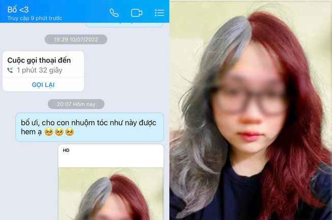 “Em muốn nhuộm tóc lâu rồi mà bố cũng kiểu truyền thống nghiêm khắc á mọi người. Xong cái cũng đắn đo nhiều nhiều lắm mới dám nhắn hỏi bố, mặc dù mới về quê hôm trước nhưng mà không dám hỏi trực tiếp nên phải ra Hà Nội rồi mới dám nhắn tin.