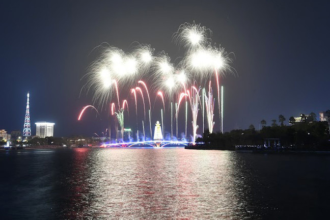 Màn pháo hoa mừng Giỗ tổ Hùng Vương bắt đầu lúc 21h khi những quả pháo hoa tầm cao đầu tiên được bắn lên từ cầu đi bộ hồ Công viên Văn Lang, Thành phố Việt Trì, Phú Thọ.