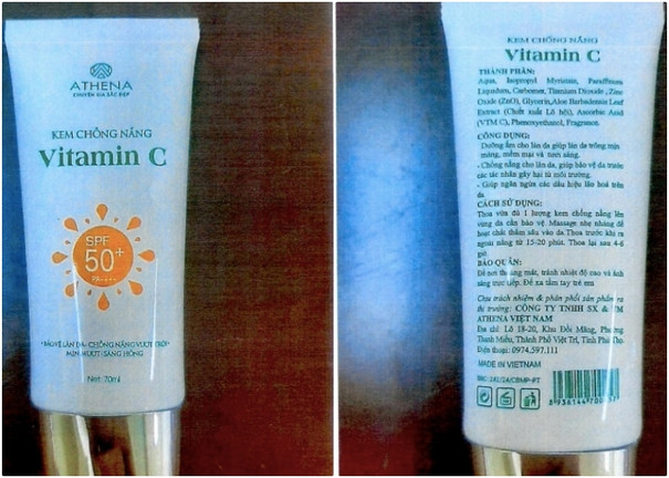 Bao bì sản phẩm kem chống nắng Vitamin C và Sun Cream bị thu hồi. (Ảnh: DAV)