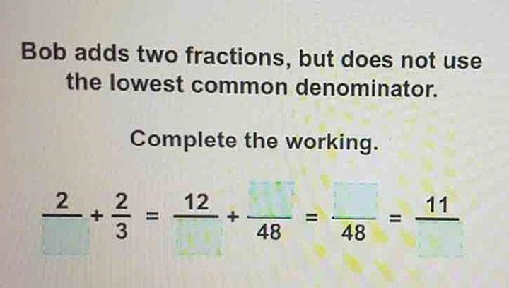 Bob cộng hai phân số nhưng không sử dụng mẫu số chung nhỏ nhất. Điền các số còn thiếu để hoàn thành phép toán.