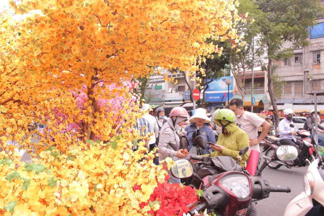 Ngoài bao lì xì, câu đối đỏ thì cây mai, cây đào làm từ nhựa cũng được nhiều người ưa chuộng. Bên cạnh việc bảo quản lâu, màu sắc rực rỡ, giá của cây cảnh nhựa rẻ hơn nhiều so với cây cảnh thật, dao động từ khoảng 100.000 đồng - 2,5 triệu đồng, tuỳ kích thước.