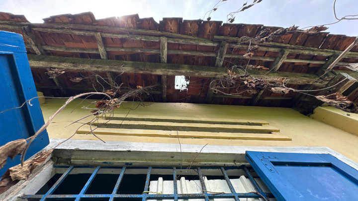 Mái được lợp bằng ngói cũng đã xuất hiện tình trạng rơi vỡ trông rất nguy hiểm.