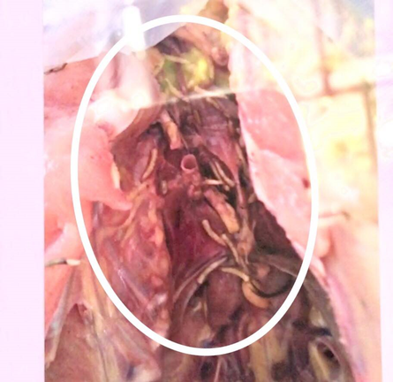 Trong quá trình giết mổ do không làm sạch nội tạng nên để những ấu trùng chưa tiêu hóa rơi ra bụng gà.