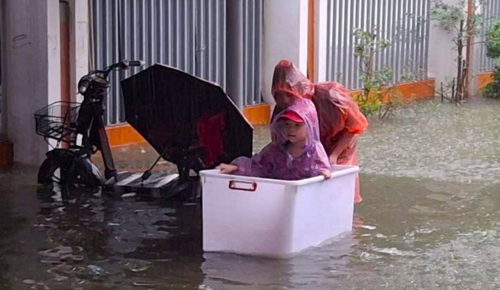 Những trận mưa lớn kéo dài khiến nhiều khu vực ở Hà Nội ngập sâu, nhiều phụ huynh phải lội nước, thậm chí mang thùng, chậu để đến trường đón con về.