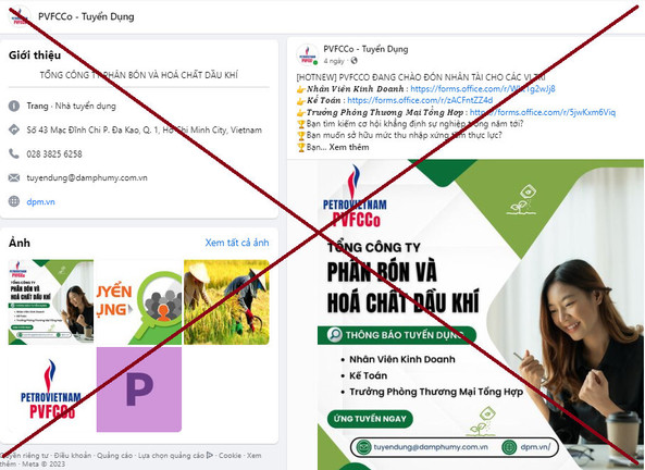 Theo PVFCCo, hiện nay, một số đối tượng giả mạo danh nghĩa của Tổng công ty Phân bón và Hóa chất Dầu khí đăng thông tin tuyển dụng trên các Fanpage giả mạo nhằm lừa đảo, chiếm đoạt tài sản của người ứng tuyển, làm ảnh hưởng đến uy tín của đơn vị.