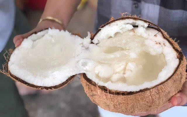 Thế nhưng, ở Trà Vinh có một giống dừa sáp, được bán ra với mức giá từ 200.000 - 300.000 đồng/quả. Nhìn bề ngoài, quả dừa tiền trăm này không quá khác biệt với những quả dừa tiền chục khác. Đến khi bổ ra mới thấy điều đặc biệt. Nước dừa sánh, sệt như keo; phần cơm dừa dày, mềm xốp; đặc biệt là vị béo ngậy và mùi thơm lừng ngay khi vừa tách vỏ.