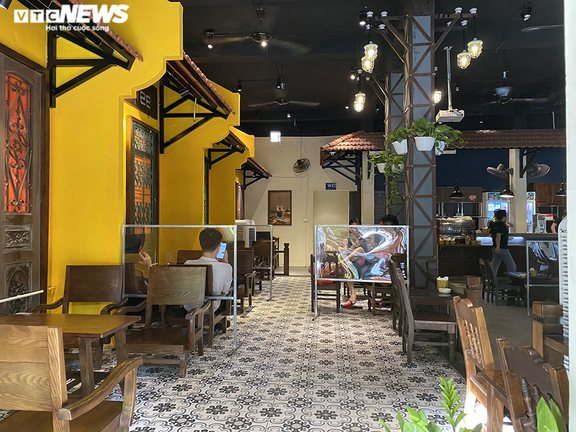 Thay vì sắp xếp các bàn các xa nhau tối thiểu 1 mét, quán cà phê trên đường Thái Thịnh (quận Đống Đa) sử dụng tấm chắn ngăn giọt bắn được đặt giữa các bàn để hạn chế việc tiếp xúc với nhau.