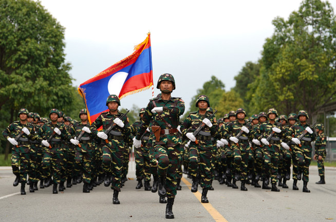Hơn 100 chiến sĩ Quân đội Lào luyện tập diễu binh, chuẩn bị cho lễ kỷ niệm 50 năm Ngày Giải phóng miền Nam, thống nhất đất nước (30/4/1975 - 30/4/2025) của Việt Nam.