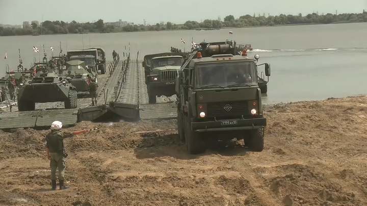 Các kỹ sư quân đội Nga lần đầu tiên lắp ráp một cây cầu nổi dài 1360m, bắc ngang sông để phục vụ cho xe tăng và pháo binh vượt qua.