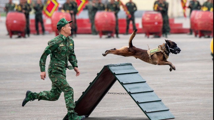 Bộ đội biên phòng sử dụng 80 quân khuyển cùng 80 huấn luyện viên tham gia luyện tập trình diễn tại lễ khai mạc Triển lãm Quốc phòng Việt Nam 2024.