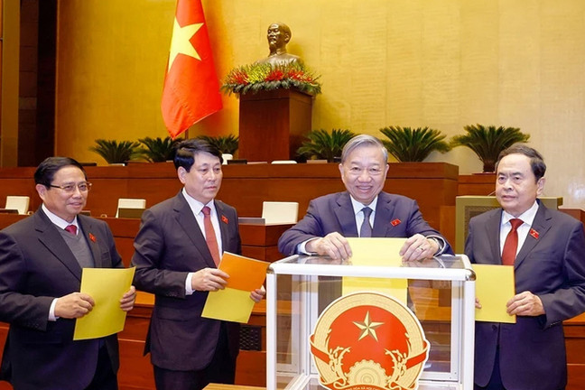 Tổng Bí thư Tô Lâm, Chủ tịch nước Lương Cường, Thủ tướng Phạm Minh Chính, Chủ tịch Quốc hội Trần Thanh Mẫn và đại biểu bỏ phiếu bầu Phó Chủ tịch Quốc hội và Ủy viên Ủy ban Thường vụ Quốc hội; phê chuẩn đề nghị của Thủ tướng về việc bổ nhiệm các Phó Thủ tướng, Bộ trưởng và thành viên khác của Chính phủ.