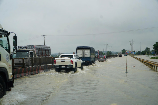 Quốc lộ 1A đoạn qua xã Hoạt Giang (tỉnh Thanh Hoá) ngập sâu do mưa lũ kéo dài gây ách tắc giao thông.