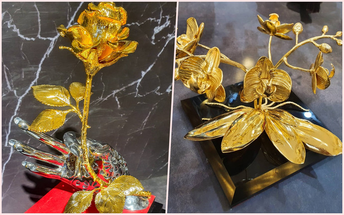 Hoa hồng và hoa lan được nghệ nhân lựa chọn để chế tác quà tặng dát vàng độc đáo.