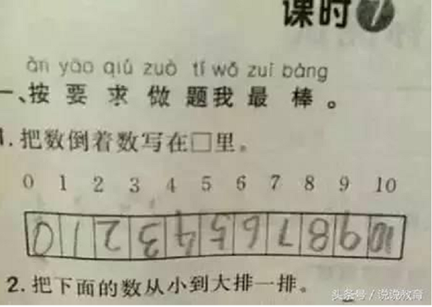Đề bài yêu cầu viết các số từ 0 đến 10 theo thứ tự đảo ngược. Thay vì điền các số theo thứ tự từ 10 đến 0, học sinh này lộn ngược từng con số và điền vào các ô trống.