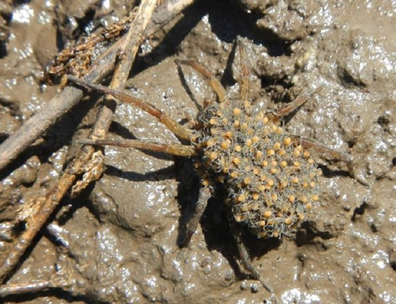 Con nhện sói mẹ mang trên lưng hàng chục con non mới nở bước đi lầm lũi trên mặt đất tạo ra một khung cảnh rùng rợn.