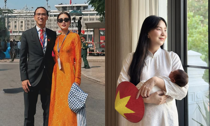 MC Mai Ngọc diện áo dài trắng, tay cầm chiếc nón in hình cờ đỏ sao vàng cùng con trai mới sinh mừng đại lễ 30/4. Đang trong thời gian ở cữ, Mai Ngọc không quên hòa vào không khí tưng bừng chung của cả nước. Sau 10 ngày sinh con, nữ MC vẫn giữ được nhan sắc rạng rỡ.