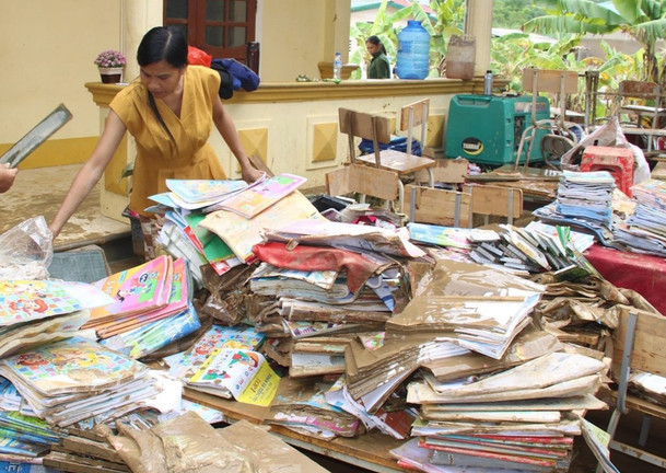 Các trường học đều ngổn ngang bùn đất, sách vở, đồ dùng học tập đều đã hư hỏng.
