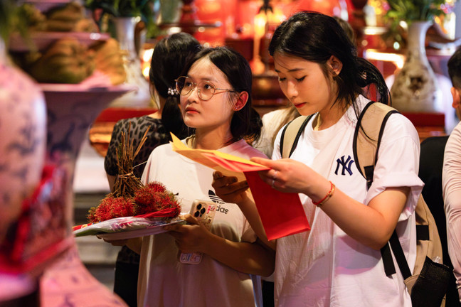Các phụ huynh với những lời khấn thành tâm, cầu cho con em mình vững vàng trong kỳ thi THPT 2025.